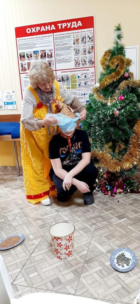Ведущая по кругу на достаточном расстоянии от центра поставила миску с зерном, ведро с водой, чашку с монетами, корзину с соломой. Курочка тоже встала в круг. Нашего волонтера Армана, нарядили Петушком, завязали ему глаза, несколько раз повернули его вокруг себя, чтобы запутать, и предложили сделать шаг в любую сторону. Пока завязывали Петушку глаза, ведущая объяснила, что так гадали на Руси, внося в избу настоящего петуха. Если «Петушок» подойдёт к ведру с водой, то для всех присутствующих год будет богатым на новые события и знакомства, если к миске с зерном — то сытным и урожайным, если к монетам — то прибыльным и успешным, если к корзине, то — к прибавлению в семействе, а если к Курочке, то для всех, кто мечтает выйти замуж или жениться, эта мечта скоро исполнится. Наш Петушок направился прямиком к миске с монетами, на радость всем присутствующим! Конечно же, мы отблагодарили Петушка за такое предсказание сладким призом!
