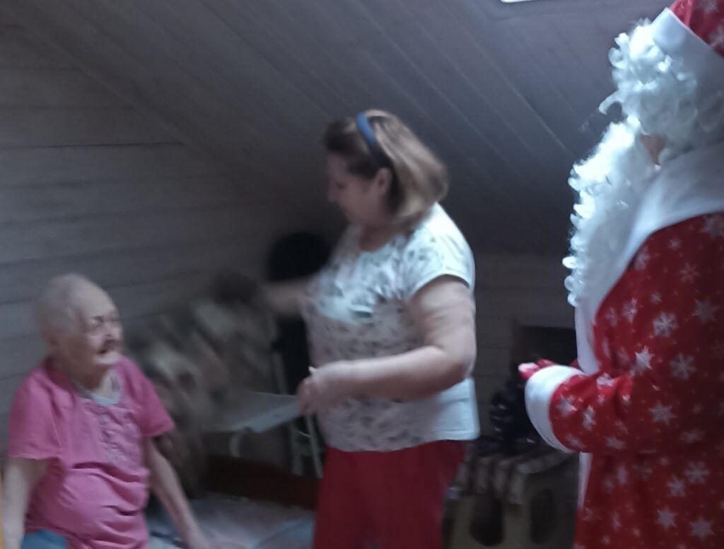 Деда Мороза ждали и довольно пожилые, бабушки и дедушки, которые с удовольствием спели Деду Морозу песенку про елочку. А еще рассказывали Дедушке о своих печалях, о желании пожить подольше и брали с Деда Мороза обещание встретиться через год! Предлагают Дедушке Морозу горячего чаю, угощение. Как откажешь? Задержится на несколько минут Дед Мороз, а человеку тепло, и целый год будет вспоминать, какие горячие у Деда Мороза руки…