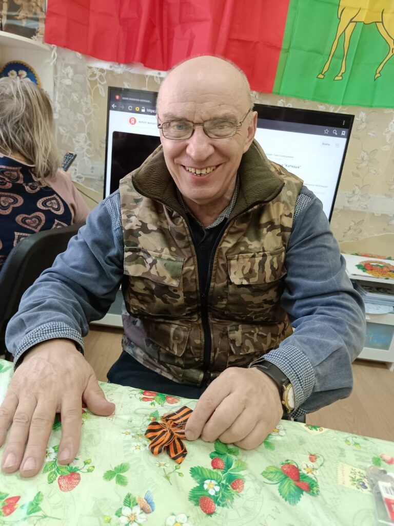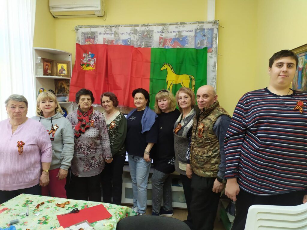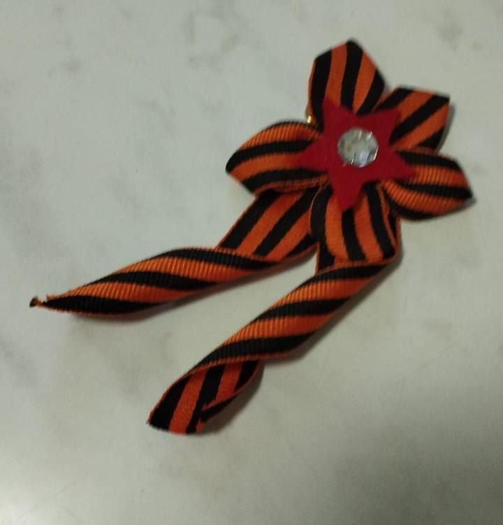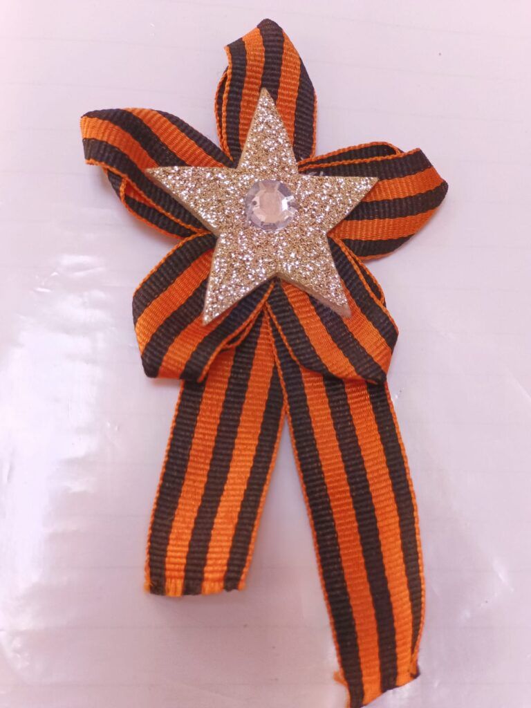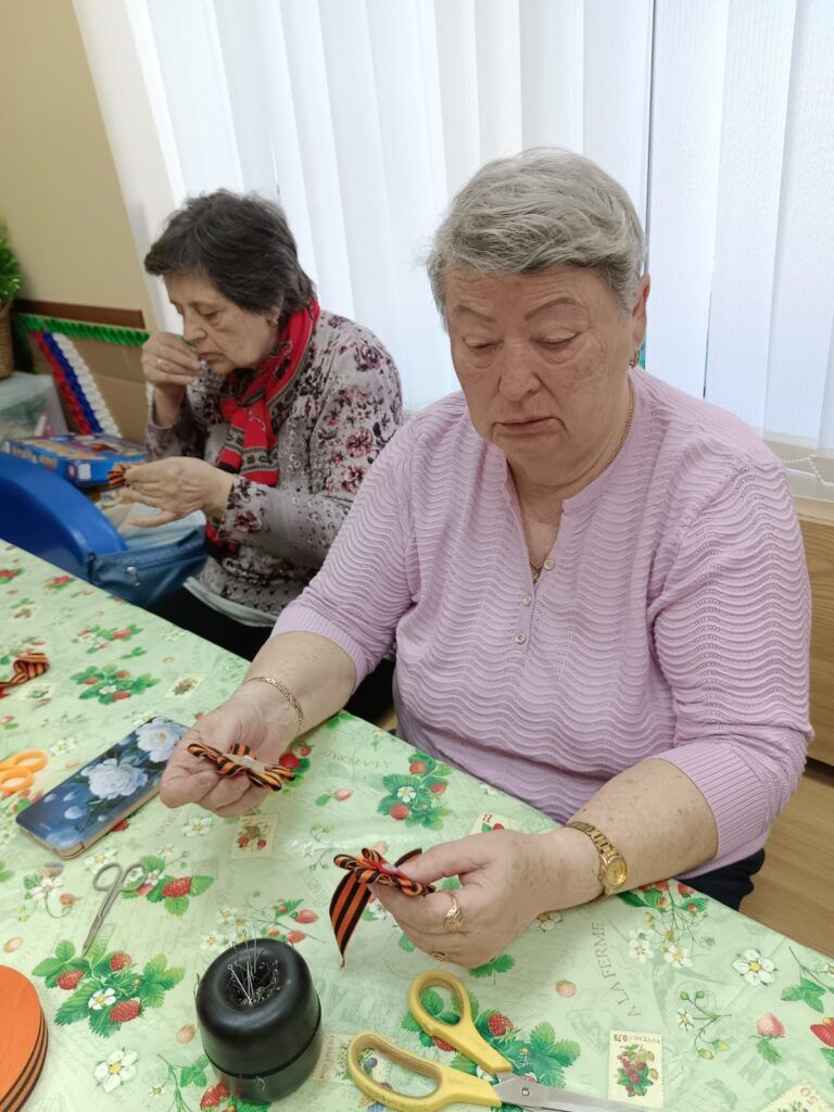 Председатель БГО рассказала о георгиевской ленточке и предложила изготовить значок для ветеранов, которые придут к нам на праздник. Георгиевская ленточка – это символ героизма, доблести и славы защитников России. Цвета ленты – черный и оранжевый – означают «Дым и пламень» и являются знаком личной доблести Российских воинов на поле боя.