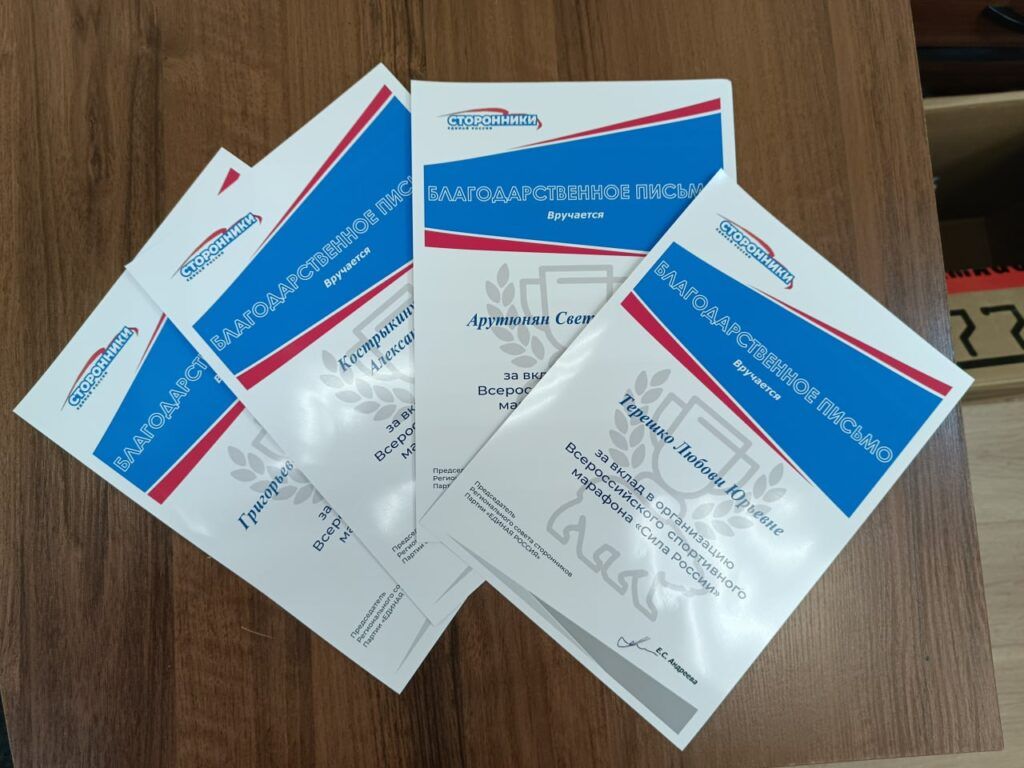 За вклад в организацию Всероссийского спортивного марафона «Сила России» Благодарственными письмами были награждены: Терешко Любовь, Арутюнян Светлана, Кострыкин Андрей, Ларюшин Андрей, Меньшова Надежда, Григорьева Надежда.