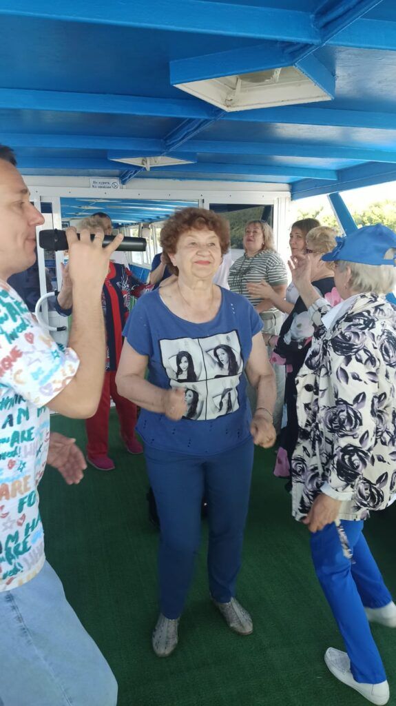 Участники, захватив с собой праздничное настроение, поздравили друг друга с юбилеем областной организации и провели весёлый концерт. Представители от каждой команды исполнили яркие номера – сыграли сценки, исполнили песни, прочитали стихи. С каждым выступлением настроение присутствующих только повышалось – этому способствовали яркие костюмы, задорные диалоги и задушевные мелодии. Скоро на нижней палубе стало тесно и действие охватило и верхнюю палубу. Там музыканты громко исполняли песенные хиты, а гости подпевали и танцевали. Внизу же звучали любимые песни под гитару и баян.