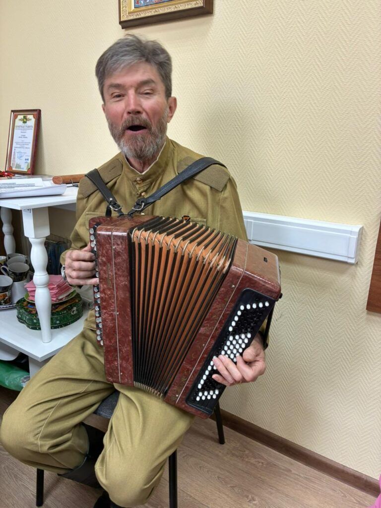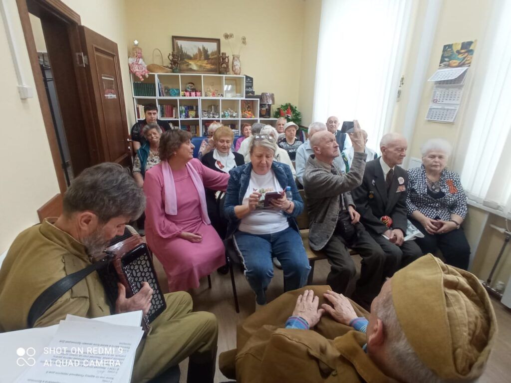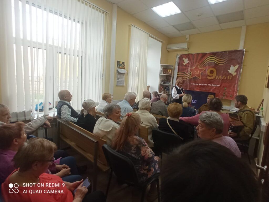 Гармонист играет мелодии до боли знакомых военных песен. Солдат Победы в плащ-палатке и пилотке поет песни фронтовых лет. Весь зал не просто подпевает. Зал поет! Наш импровизированный, но очень хорошо подготовленный, концерт должен был закончиться песней «День Победы», но, не тут-то было. Звучит вальс, и пары начинают кружить,буквально на «пятачке»,- уж больно маленький у нас зал!