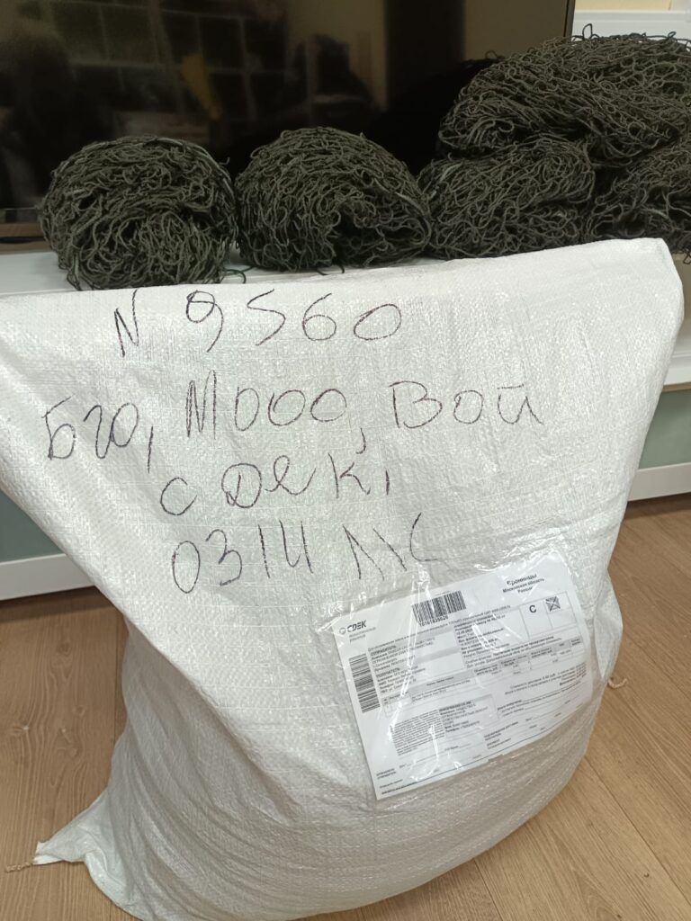 В сентябре провели Акцию по сбору денежных средств и закупили 120 метров сетеполотна на сумму 23338 рублей. Кострыкин Андрей и Арутюнян Арман доставили довольно тяжелую покупку из пункта доставки в помещение нашего общества. Терешко Любовь нарезала сетеполотно по размеру 3х4 метра (30 штук) и обвязала обмоточным шнуром для прочности маскировочной сети. Кузнецов Андрей, Тиханушкина Надежда, Григорьева Надежда, Арутюнян Севада и Манкуш Олег нарезали ленты из спанбонда.